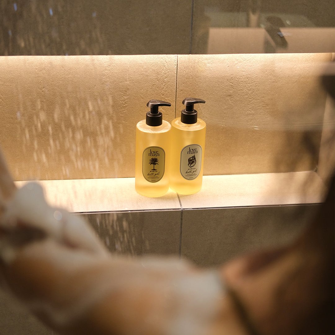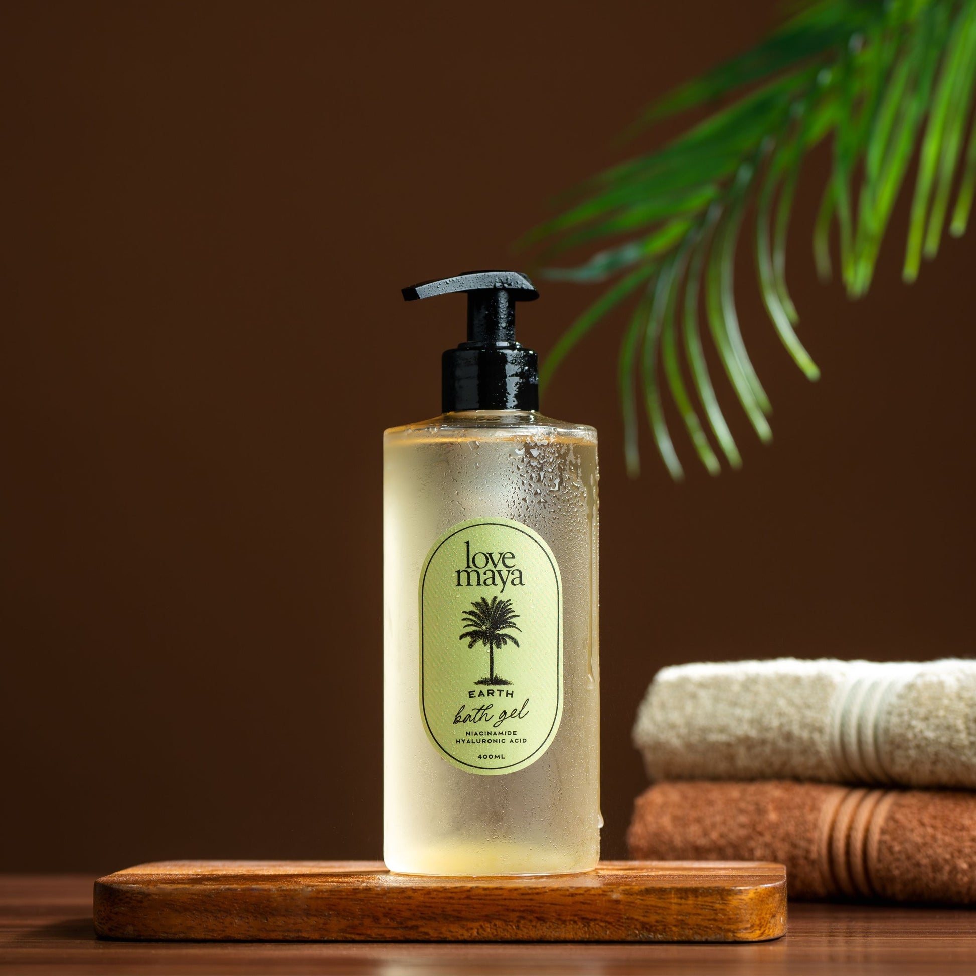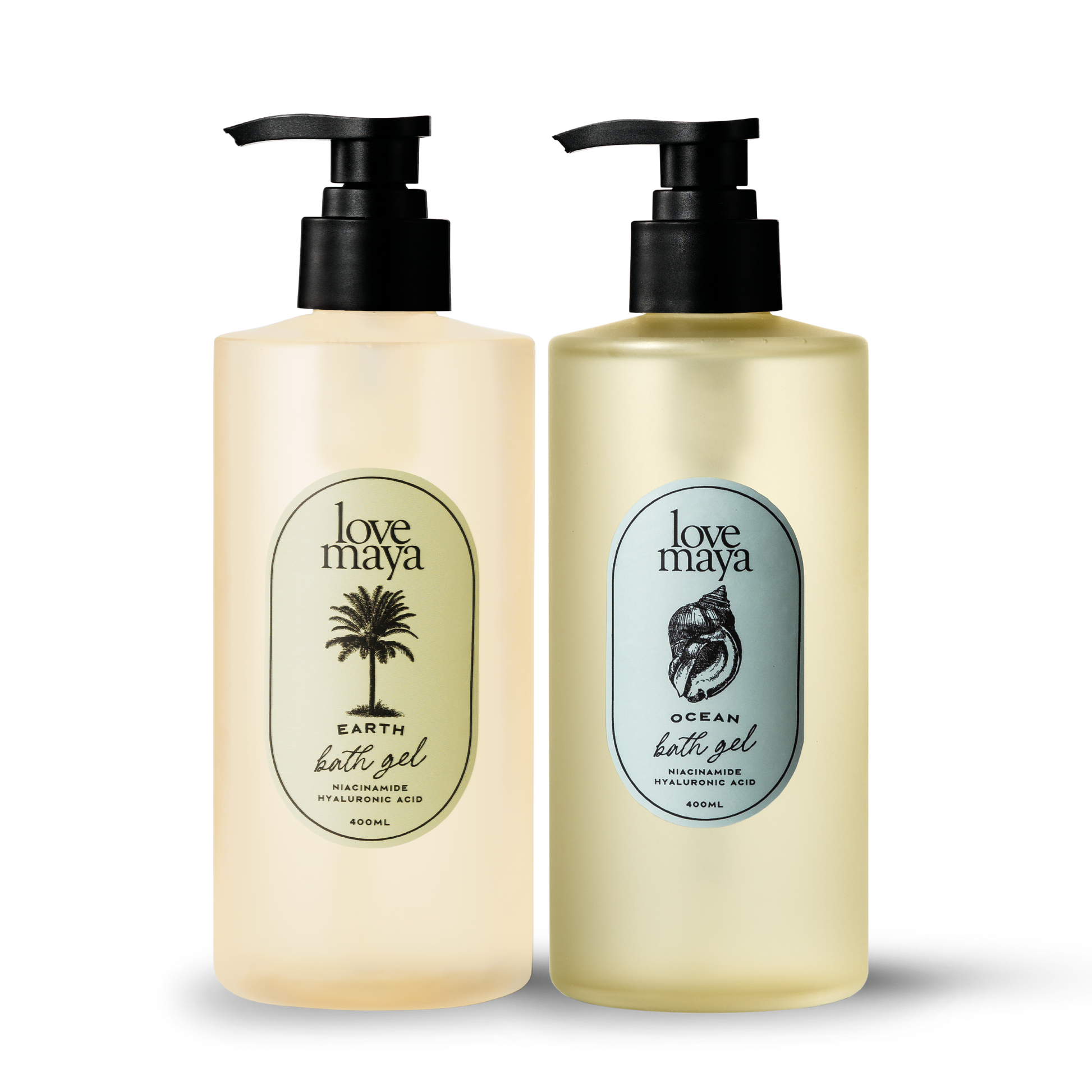 A refreshing blend of citrus and sandalwood inspired by Bali's sea breeze, and Earth Bath Gel, an earthy, grounding mix of bergamot and patchouli inspired by Bali's resort villas.